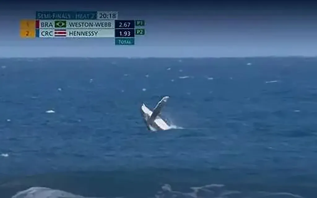 Млекопитающее появилось в кадре во время полуфинала между бразильянкой Татьяной Уэстон-Уэбб и костариканкой Брисой Хеннесси. Кит держался на безопасном расстоянии и не приближался к спортсменкам.